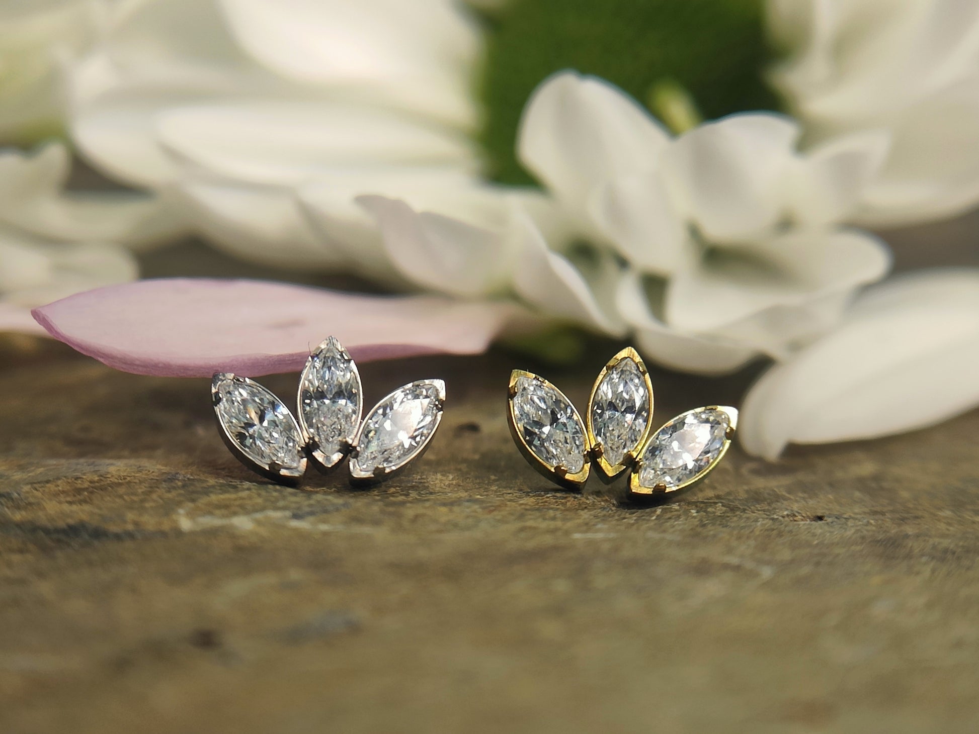Titanium marquise fan in white CZ. Threadless end. Threadless post not included.