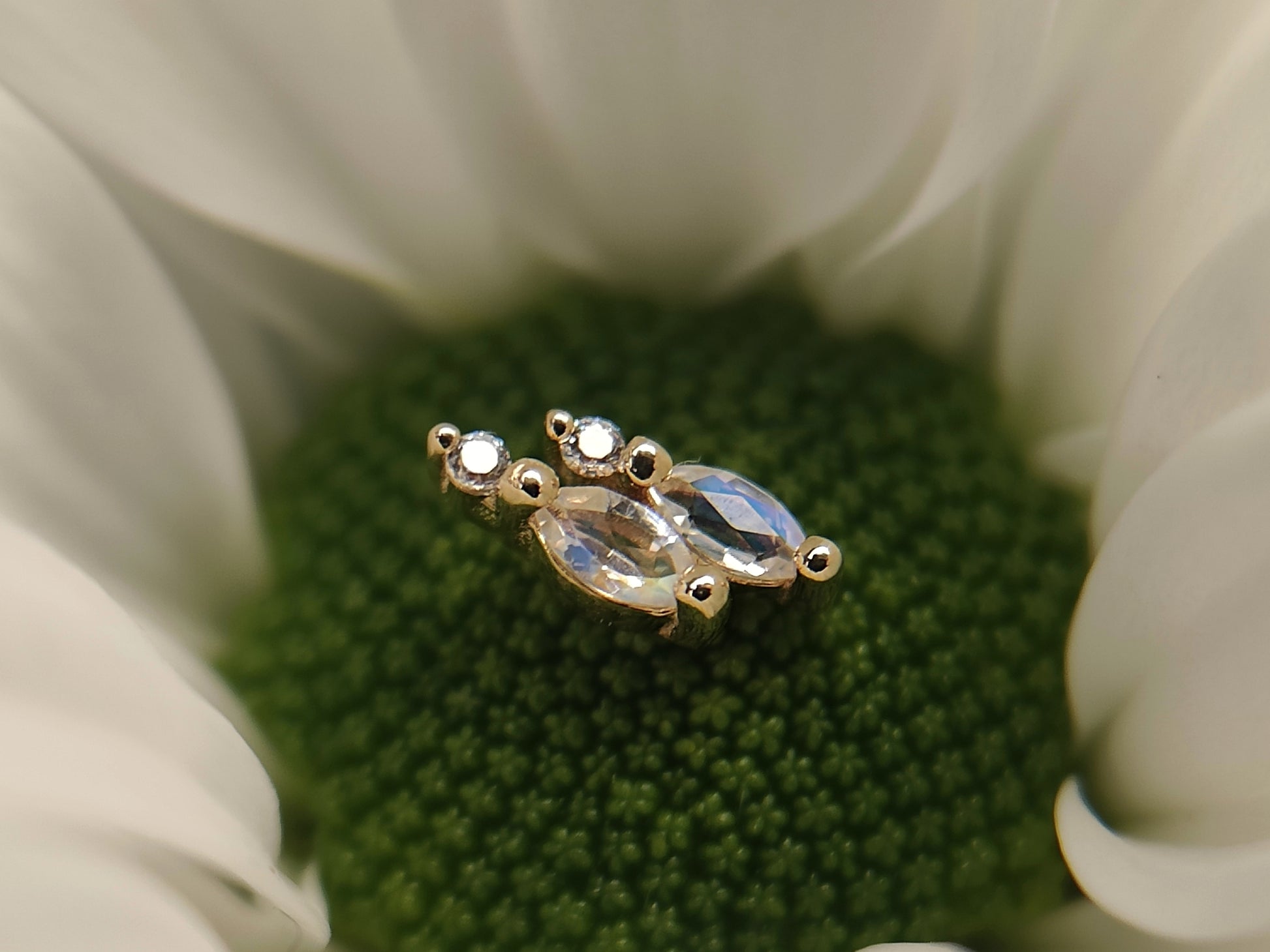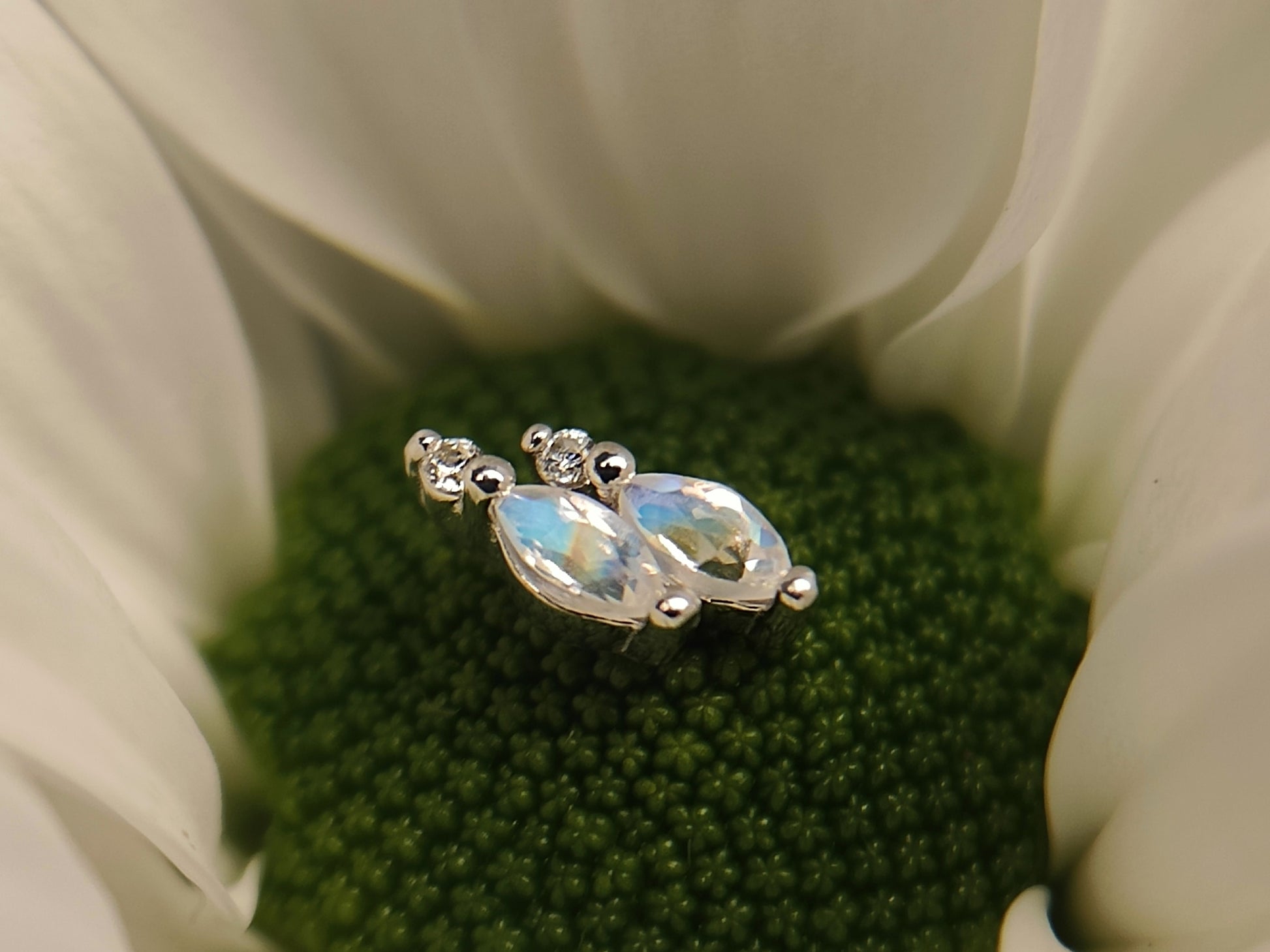 14ct gold. 2x marquise stones in rainbow moonstone with tiny CZ accents. Threadless end. Threadless post not included.
