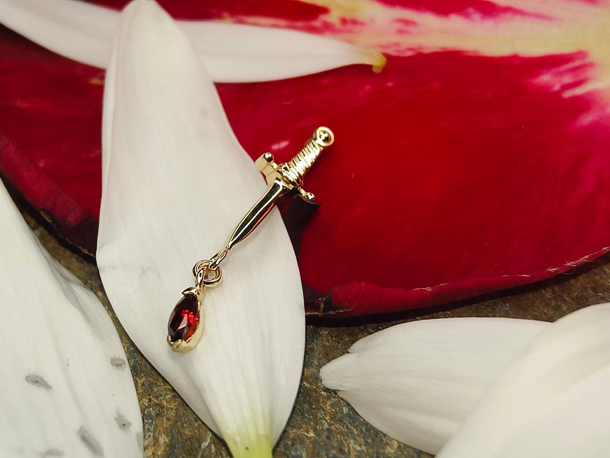 14ct yellow gold with Garnet stone detailing. One Garnet stone in the hilt and one Garnet marquise on the chain. 9mm dagger with chain. THREADED END. Threaded post not included.