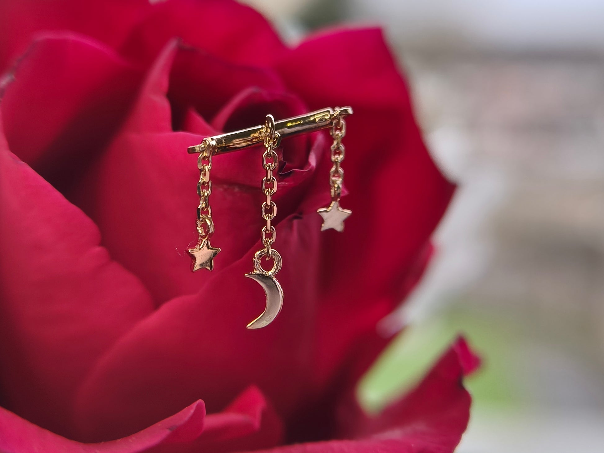 14ct gold hidden helix piece with stars and moons details. Threadless end. Threadless post not included.
