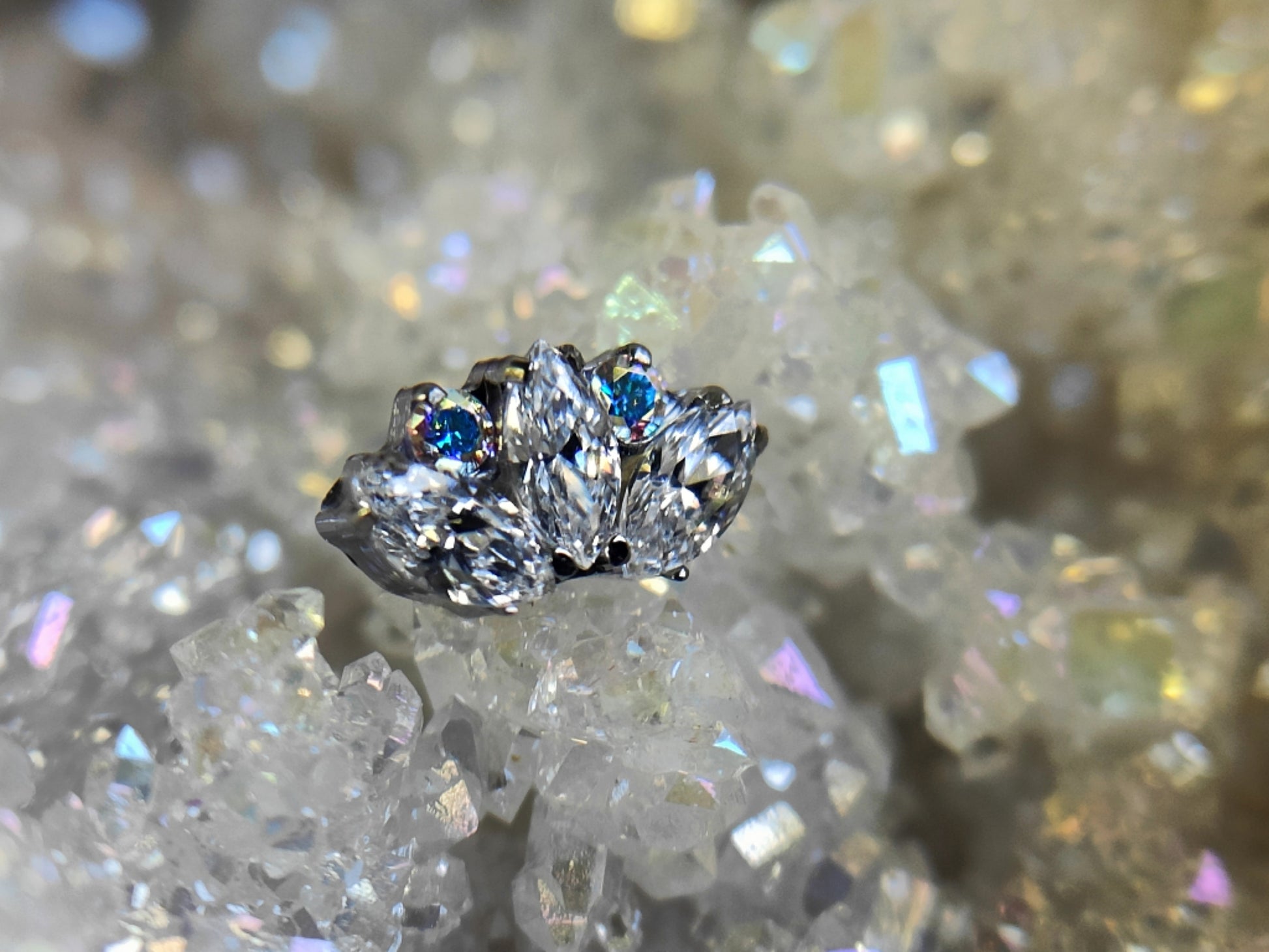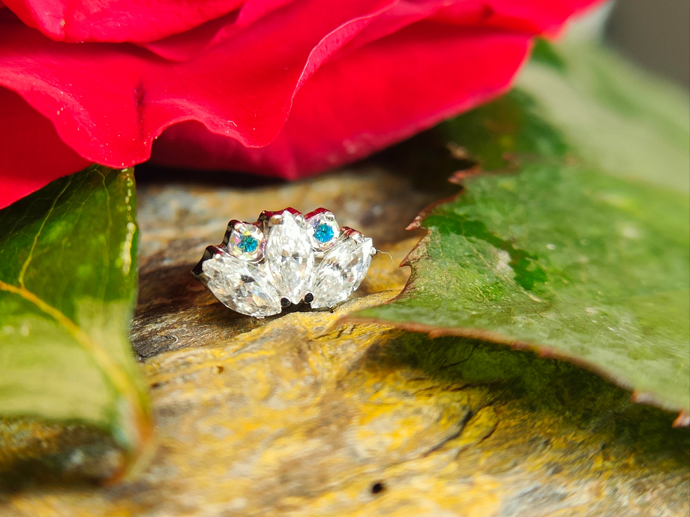 Threadless attachment. Implant grade titanium. 3x 4mmx2mm stones in white cz with 2 small round stones in AB CZ. Threadless post not included.