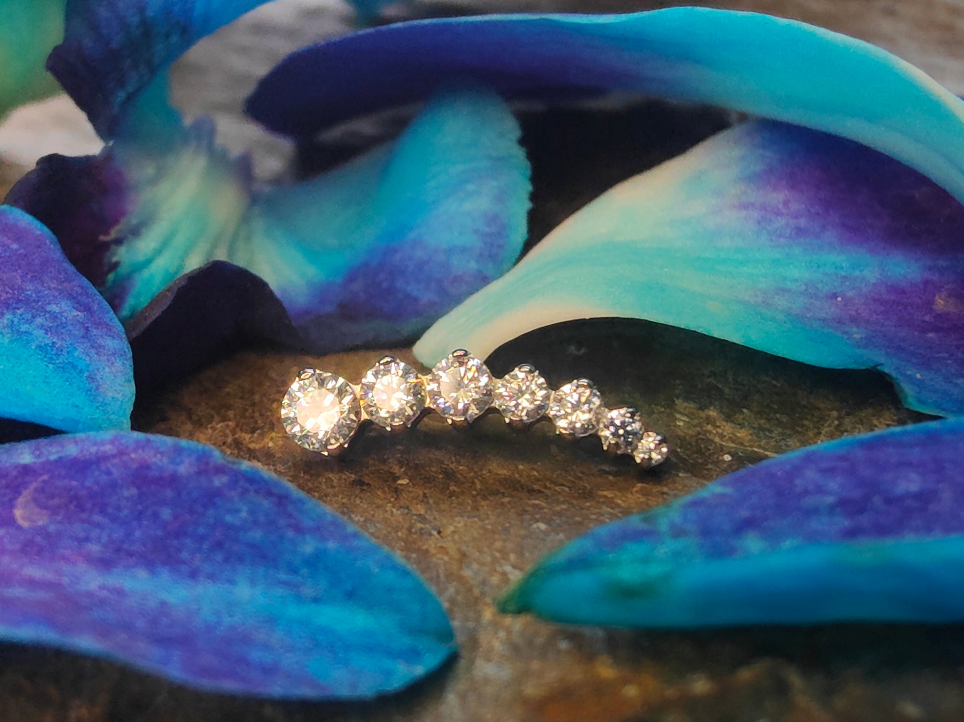 Implant grade titanium Threadless end made up of 7 white CZs in descending sizes. Roughly 15mm in length. Threadless post not included.