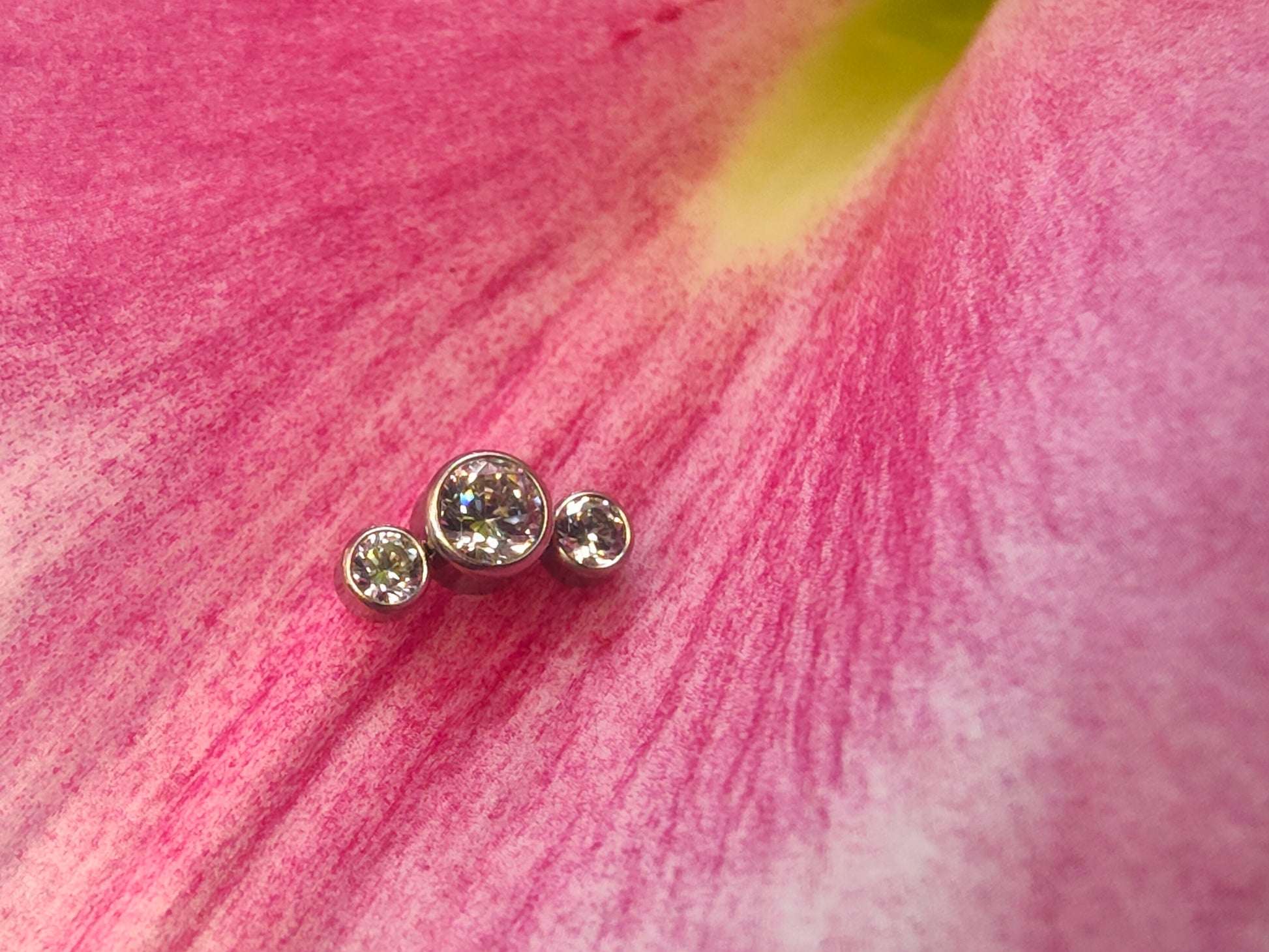 Threadless titanium attachment. 3 gems in white Cz. Threadless post not included.